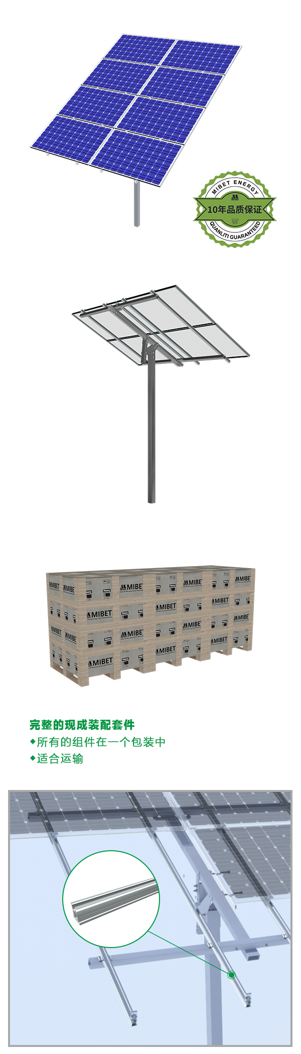 MRac 地面单立柱光伏支架 是一款专门针对大型商业及公共事业电站研发的解决方案,适用于各种小山丘及不平整区域项目,该产品设计灵活,可支撑6块板、8块板及10块板,全部配件采用热浸镀锌钢和铝合金,使用寿命更长,结构上的优化设计,有效的提高了安装时效,大大降低了工程安装成本。